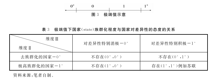 将维度化约为0-1的定类变量,可以得到四种组合。这四种组合所对应的国家民族建设路径在理论上都是自洽的,在现实中也都有代表性的国别案例。第一种组合是低族群化的、消极对待差异性的国家,例如法国。法国不进行任何形式的族群身份识别,在单一制下实施非常有限的族群地方自治(对科西嘉和布列塔尼),其再分配性质的社会团结政策不以族群为边界,在历史上压制除法语之外的其他语言。这是典型的“公民同化”模式。第二种组合是低族群化、积极对待差异性的国家,例如瑞士。瑞士尊重多元文化,设立四种官方语言;但其联邦制和财政均衡政策都并非基于族群或语言分区。第三种组合是高族群化、对差异性消极的国家,例如印度。印度的许多邦是基于族群和语言划分的,“保留制度”(Reservation System)为各个“表列部落”(Schedule Tribes)提供了立法机构、政府部门和公共机构、公立学校的配额。然而,印度的高族群化程度并没有导向对差异性的包容,依靠印度教民族主义塑造国家民族认同的代价是穆斯林群体日益被排斥和边缘化。第四种组合是高族群化的、积极对待差异性的国家,例如苏联,其标志是“推广使用民族语言,创建民族知识分子和政治精英群体,并正式地使各地传统族群以国家形态实现组织化”。但是,本文所提出的几个维度实际上并非0-1的定类变量,而是定序或定距变量。当我们在维度Ⅱ和维度Ⅲ上分别取极端值(以星号标注,见图3),代入上述2*2矩阵,会发现四种组合中有三种都无法成立(见表3)。
