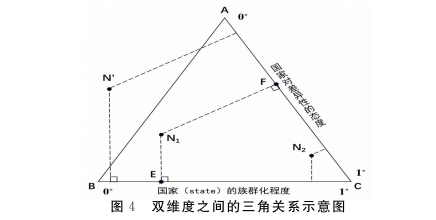 倘若用图形表示维度Ⅱ和维度Ⅲ的上述关系,三角形是一个合适的选择。如图4所示,我们以三角形的底边和右边分别表示这两个维度,从三角形中任意取点N,表示特定国家的国家民族建设路径。由该点向这两条边(BC和AC)作垂线,所得垂点(E和F)即为该国国家民族建设路径在此维度上的状况。由图易见,使BE和AF同时为小值的点(如N’)只能在三角形外取到,这就意味着表3中的(0*,0*)不存在。同理,使BE和CF同时为小值,CE和AF同时为小值的点也只存在于三角形外,对应表3中的(0*,1*)和(1*,0*)不存在。但三角形内存在点N2使CE和CF同时为小值,对应表3中的(1*,1*)存在。