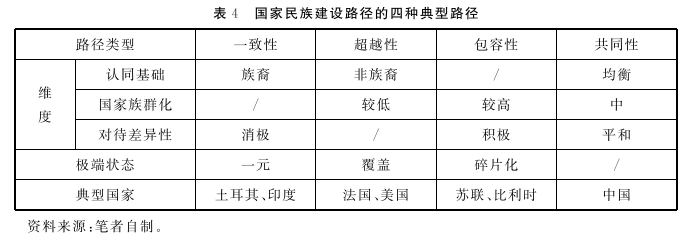 国家民族建设是民族政治分析的重大理论和现实问题。国家民族建设的成效主要受到国家民族建设禀赋、能力和路径三个层面因素的影响。其中,国家民族建设路径的作用至关重要。无论是深刻理解国内外民族工作的经验和教训,还是讲清楚中国特色解决民族问题正确道路的优越性,都需要对国家民族建设路径进行系统的比较研究。着眼于此,本文在现有理论的基础上,提炼出国家民族认同建设的基础、国家(state)的族群化程度、国家对差异性的态度这三个维度,以此构建了国家民族建设路径的类型学框架。这一类型学框架呈现为三角坐标,区分出一致性、超越性、包容性和共同性这四种典型的国家民族建设路径。四种路径之间既有类型学逻辑上的并列关系,也有民族政治历史演化的递进关系。比较分析表明,国家民族建设路径“所得即所失,有偏即有弊”。一致性路径、超越性路径、包容性路径各自的优势与缺陷是一体两面的,倘若走向极端则更容易导致国家民族建设的挫败。相较之下,在三个维度上均靠近中间位置的共同性路径更加平衡、完备,能较好避免国家民族建设极端化带来的负面后果。