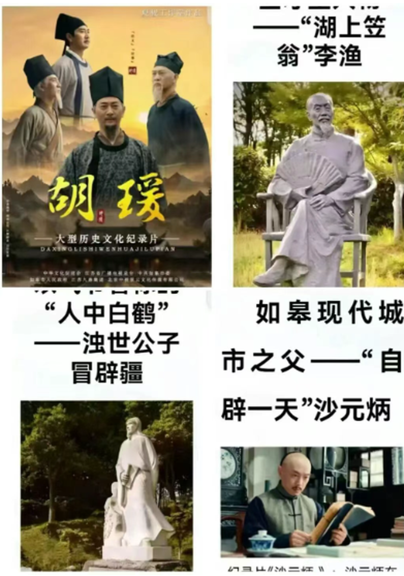 图4,这4位被称为“如皋四贤”:1,北宋思想家、教育家胡瑗;2,明末清初戏剧家、美学家李渔;3,明末清初文学家、爱国志士冒襄(巢民,字辟疆);4,清末民初教育家、实业家沙元炳。看,这是何等深厚且独特的文化底蕴!