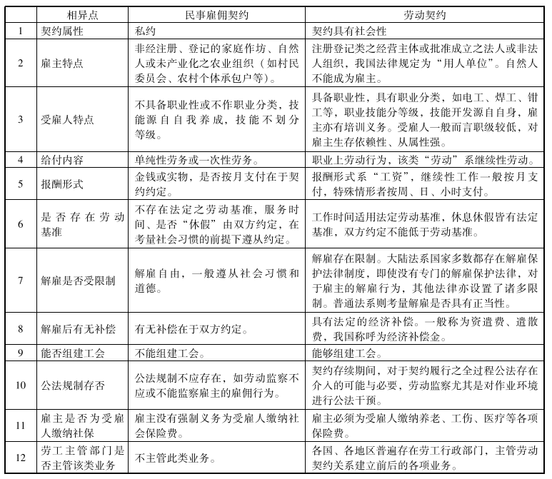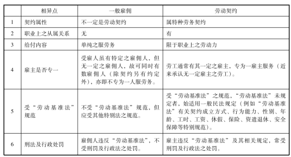 我国台湾地区学者林诚二对于一般雇佣与劳动契约相异之处通过列表进行了比对。下表系从各个视角进行的比对:
